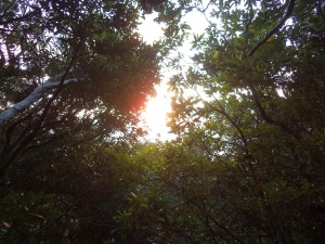 | 緩やかな上りが続く | 朝陽を浴びた樹林 | 標識が要所にある |