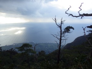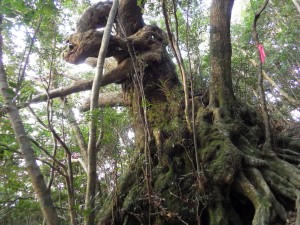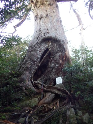<はじめに> 九州百名山(山と渓谷社編九州百名山地図帳)残り1座となったのは、今年の4月であるから約8ケ月も経過している。その間、何度か計画したが仕事の都合と天候が噛み合わなくここまでずれこんでしまった。 冬は海が時化ると言うが、屋久島での登山といえば朝一番に到着する船(フェリー)が便利である。 覚悟していたことだが、案の定、往路も復路も船は波を受け大きく揺れながらの航海であった。 しかも復路に予定していた便は欠航となり、違う船会社の同日午後の便に何とかキャンセル待ちで乗れたのは、不幸中の幸いか。 しかし、そのおかげでモッチョム岳頂上でお会いした長崎の方々と交流ができた。 <初日は観光> 宮之浦港に着くとモッチョム岳登山口へと車を走らせる。灰色の雲が空を流れ、雨はどうみても止みそうにない。登山口に着いても全くのその気配がない。 「ここは、辛抱して明日に期待するか・・・」と自分を無理やり説得するようにつぶやいていた。 今日は1日観光することにして観光スポットや施設を回ることにした。たっぷりと時間があるので施設のビデオなどは全て見る。おかげで今では屋久島ガイドができるのではないかと思うくらい物知りになった。 昼食は前回訪れた時に食べた「屋久島風うどん」、夜はスーパーで買い物をして質素な食事を前回に引き続きお世話になる「ビジネスホテル仔馬」の部屋で済ませ、明日に期待して早めに就寝する。でも雨は止まない。 <2日目は、いよいよ登頂> 2014年12月5日(金) ■出発時間:7:00 登山口 ■メンバー:単独 外灯の明かりで見る限り雨は降っていない。でも星は見えない。暗い中、雨具を着用し、ホテルを静かに出る。時計を見ると6時20分。 車のエンジンをかけ出発。間欠ワイパーが動く。やっぱり雨か・・・・。 登山口に着く頃にはすっかり明るくなり、雲もどうやら切れてもしかして晴れるかもと期待を膨らます。予報は曇りだが降雨確率は30%から40%へと下り坂だ。 「もし、これで晴れたらよっぽど運が良い俺だ。」と日頃の行いが良いからだと全く根拠のないのに独り言をつぶやく。 天候が崩れる前に山頂へと気がせくのでどうしてもペースが乱れる。そのためか途中で息が切れてしまった。これはまずいとペースダウンしてしばらく歩き始めると苦しい状況を脱することができた。焦りは禁物である。 万代杉を見て尾根道が続くかと思いきや谷間を降るようにトラバースしモッチョム太郎を横に見る。万代杉もモッチョム太郎も帰路でゆっくり拝見させていただくことにして先に進む。 きつい上りが続くが巨木や奇木を楽しみ、樹の間から時折見える対面の耳岳の稜線を眺め次の目標地点の神山展望台が近づいていることを知るとウキウキしてくる。 上部が見えてきて潅木帯になるといつのまにか尾根に出て平らな大きな石の上に立っていた。 道標はないが、ここが神山展望台のようである。ここからモッチョム岳頂上が見下ろせる。そう、山頂よりもこの地点の方が39mほど高いのである。そのまま真っ直ぐに尾根を進みそうになると踏み込めないように赤い紐が張っている。これがなかったら真っ直ぐに進むところだ。ここから左に一旦降り、山頂への尾根道に取り付く。 (次ページへ) |