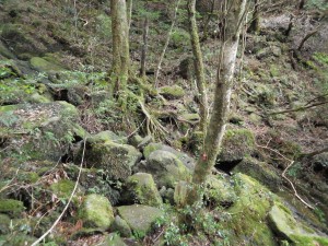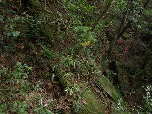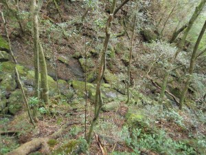| 平坦な道になる | ヒメシャラが多い | 苔むした谷間を通過 |