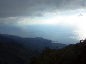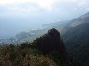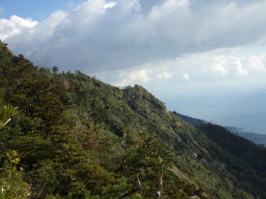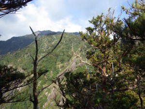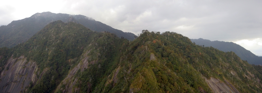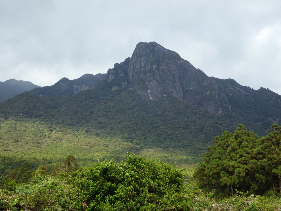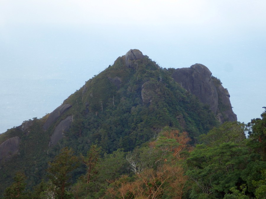 | (前ページから) 岩壁の麓を通過すると岩場をロープを補助によじ登ると目の前に坊主岩のモッチョム岳頂上部が現れる。目を凝らすと数人の登山者が岩登りにチャレンジしているようだ。ここからはヤセ尾根で左側は笹があるものの切れ落ちているので油断できない。 風雨が強ければ危険な場所である。ヤセ尾根の真中を歩く頃にはもう山頂が近い。ロープを補助に岩場をよじ登ると頂上直下の巨岩の下に出る。ちょっとした棚になっているので休憩場所には良い場所だ。景色も最高である。 上部は賑やかだが見えない。この岩はロープを頼りに登らないといけない。慣れていないと苦労するかもしれないなと思いながら登りきるとそこは予想通りの光景だ。 360度の絶景は少々どんよりとしているが昨日の天候を思うととても贅沢な景色だ。 遠くから見えた登山者のグループは長崎からの方たちでちょうど食事(朝食?)をとられていた。 私がセルフタイマーで写真を撮ろうとしていると食事中にも関わらず写真を撮ってあげると言われお言葉に甘えた。おかげで私にとっては最高の場面が記録された。本当に感謝である。 私も朝食をしていなかったのでここでと思ったが雲行きが怪しいのでホットコーヒーだけ飲んで往路を戻ることにした。 神山展望台まで戻ると一安心。ゆっくりと歩を進めモッチョム太郎や万代杉をもういちどじっくりと鑑賞する。 ところが・・・・・携帯が鳴る。なんと明日の朝のフェリーが欠航との連絡。これは困った。もし、明日晴れれば、もう一日滞在してどこか登るのだが、どうも明日は今日よりも天候は良くない。とにかく下山してから手を打とうと考え落ち着かない復路となった。 無事下山して売店に入ると昨日お話した方が覚えていてくれて「昨日登らなくて良かったね」と声をかけてくれた。一人旅をしていると人の温かさを求め、それに出会うととても幸せな気持ちになれるものである。 明日のフェリーは、船会社が違うが昼の便があってキャンセル待ちとのこと。少々高くつくがしょうがない。と諦めてそれよりも今日はお祝いだ。ということでまずは尾之間温泉。とろっとろの湯に浸かる。入浴料は200円(但し、石鹸やシャンプーはなし) そしてスーパーに寄り、宿で少々遅めの昼食というか打ち上げを一人で行う。夜になると居酒屋(寿司屋)で地魚の刺身やトビウオの塩焼きをつまみ屋久島の夜を楽しんだ。翌日は朝から宮之浦港でキャンセル待ちをするが、運よく乗船できさらに長崎の方々と再会し、話も弾んで楽しい航海となった。 何日もかかった一座だったが、それだからこそ思いで深い山行となった。 これで九州百名山(山と渓谷社編九州百名山地図帳)の100座は完登したが、できれば旧版に掲載されている未踏の山も歩いてみようと思う。 今回も山に自然に出合った人に感謝!! ■コースタイム 登山口-(70分)-万代杉-(30分)-モッチョム太郎-(35分)-神山展望台-(35分)-頂上-(35分)-神山展望台-(30分)-モッチョム太郎-(20分)-万代杉-(60分)-登山口 ※休憩時間含まず。全行程で約6時間でした。 ■参考 (行きのフェリー)はいびすかす 鹿児島(谷山港)18時発種子島経由 →翌日7時宮之浦港着 ※売店なし 種子島で停泊 (帰りのフェリー) 屋久島2 宮之浦港 13時30分発 →17時40分鹿児島本港着 ※売店あり うどん・そばコーナ、展望室 (スーパコンビニ) セブンイレブンなどの大手コンビニはない。おにぎりや弁当も少ない。 キャンプや自炊、昼の弁当を仕入れるならAコープが豊富。 |