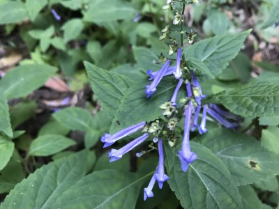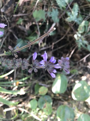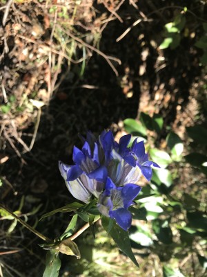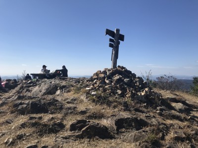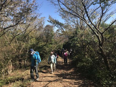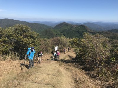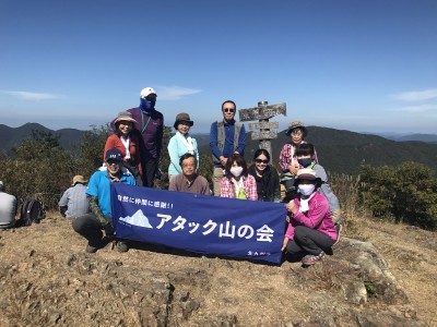 石畳の萩往還の道は、以前歩いたときはとても滑りやすいと感じたが、今日は感じない。おそらく乾燥しているからだろう。途中の史跡を目にするが、皆興味がないようで説明板を読む者はいない。それでもリーダとしては少しでも興味をもってもらおうと石積みを指して「これはかなり古いね」とか、声をかけてみたりする。石堂峠から自然歩道になると長いアップダウンの広い道が続く。たまに花があると少々退屈な道も楽しめる。二ツ堂登山口との合流点からは、樹木が低くなり視界が開け、気持ちの良い坂道を少々喘ぎながら登ると山頂に到着。360度の大展望に感激。西鳳翩山も良く見える。山頂では既に多くの登山者がランチタイムを楽しんでいた。少々遅くなったが、我々もここでランチタイムとする。食事を終え、集合写真をその場にいた他の登山者の人が快く撮ってくれることになり、カメラを忘れ三脚だけ持ってきた私を救ってくれた。本当に感謝である。そ、そうなんだ。今回はコンデジを忘れ、全てスマホで写真を撮ったのである。おまけに下山時は電池切れになり、携帯しているモバイルバッテリーが調子が悪く、メンバーに借りる始末。この数年間でこのような失態は初めてである。