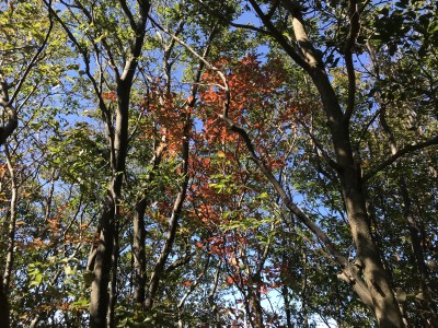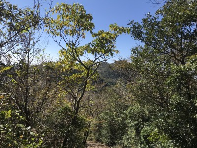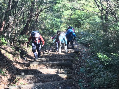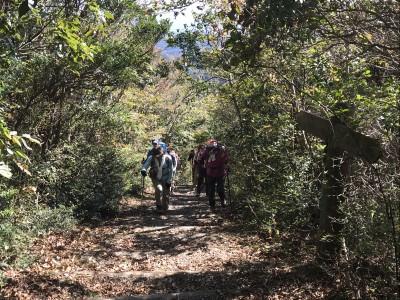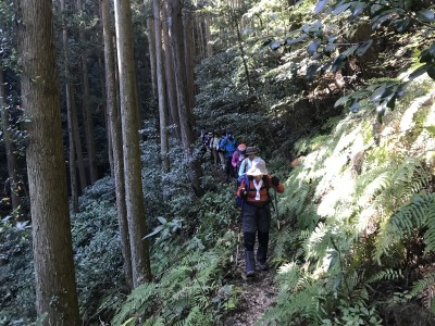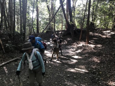 集合写真を無事撮ってもらい、下山開始だが、山頂までのメンバーの状態をみてコースを短縮することにした。計画では二ツ堂登山口へと降り、舗装道を歩いて錦鶏鶏ノ滝駐車場へと戻る予定であったが、直接錦鶏ノ滝へと降るナマナマコース(なぜナマナマコースか不明)を降ることに。