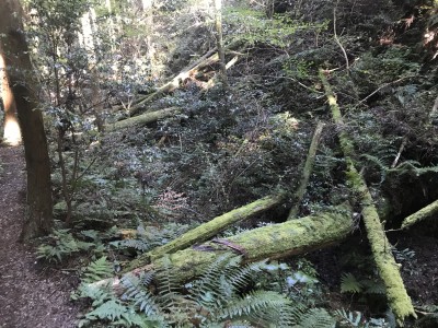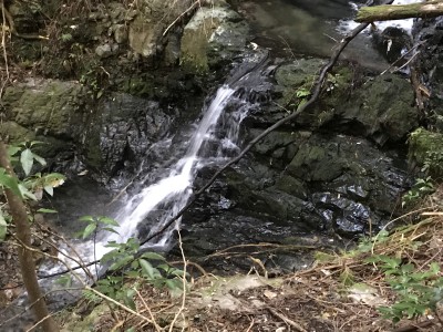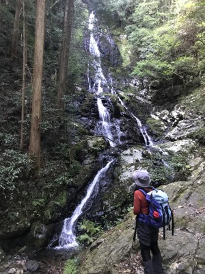山頂から往路を降り、合流点から二ツ堂登山口へと進む。途中で「ナマナマコース」と道標があるので左へと入り込む。道標に「悪路」とあったので気になっていたが、今まで歩いた自然歩道と比べ、いわゆる普通の登山道である。確かに倒木があったりとやや荒れ気味ではあるが。途中で一度休憩して錦鶏ノ滝へと到着。しばらく滝を拝んで駐車場へと無事下山。ここでオブザーバの方たちとはお別れ。そして2台の車は高速道を北九州へ向け走る。今日も自然に山に仲間に感謝!!