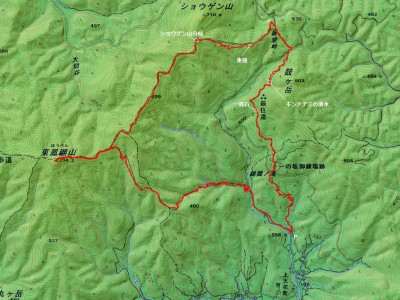 駐車場-(28分)-六軒茶屋跡-(43分)-板堂峠-(25分)-ショウゲン山分岐-(40分)-鞍部合流点-(17分)-山頂-(15分)-合流点-(22分)-ナマナマコース入口-(45分)-錦鶏ノ滝-(12分)-駐車場 ※休憩時間含まず。全行程で5.5時間でした。 |