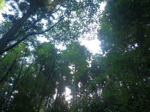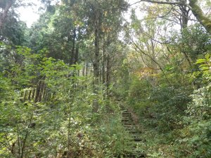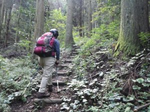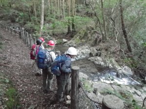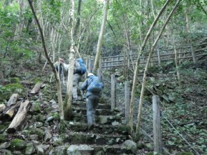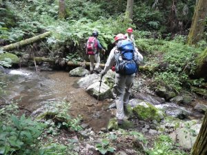 | 沢を横断 | 階段が続く | 木漏れ日が爽やか |