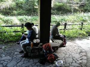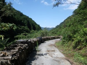 | 沢を横断すると登山道へ | 無事登山口 | 道路わきにシイタケの原木 |