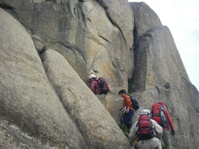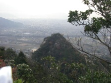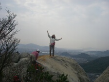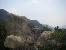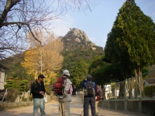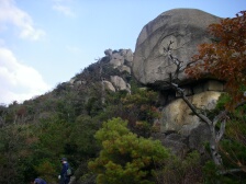 2007年12月8日 天気 曇り時々晴れ 遊山歩の今年最後の山はシュー左衛門さんが担当で山口県は防府の右田ケ岳になった。防府と言えば今年新たな会員となったあずきさん、フクロウさんのホームグランドでもある。そのため防府のメンバーの方が贅沢コースを計画してくれた。(下見までしていただいた)九州メンバーは我家に7時30分に集合、そこから相乗りして、高速で登山口近くの右田小学校付近まで行く。小学校の前には駐車場があって登山者が駐車できるようになっていた。ここで今日の参加者全員集まった。参加者はMORIさん夫妻。さこちゃん夫妻、シュー左衛門さん夫妻、あずきさん、フクロウさん、KENさん、Tさん、そして私たち夫婦の12名となった。 <アクセス> 福岡方面からだと中国自動車山口Jctで山陽自動車に進み防府西ICで降りる。料金所を出てまっすぐ高速道と平行して走り、2つ目の信号(沖高井)国道262号へ左折し、2つ目の信号を右折すると右田小学校が見えてきます。 <今回のコース> 今回のコースの概要はまず右田ケ岳の西ノ峰に登頂し、そのまま下山。そして西目山に登頂し、下山後再び右田ケ岳を目指すというかなりロングランで右田ケ岳を2度登ることになります。コースは8の字で同じルートはありません。まずは、右田ケ岳南側の天徳寺より歩きはじめます。すぐに歴代住職の墓地があります。石段から砂利道となり巨岩だらけとなり、石に彫られた磨崖仏に驚かされます。巨岩の中、急登すると出発から約40分でピークに着き、標識を見ると「石船山(せきせんざん)」と書かれています。もちろん眺めも最高です。記念撮影を済ませ一旦下り上り返します。道は平坦となり東側を回り込み上り詰めると西ノ峰と中ノ峰の分岐鞍部に出ます。今回は西ノ峰に進みます。分岐からすぐに西ノ峰で南と西側の展望が開けています。これから登頂する西目山も一望できます。展望を味わったら下山開始です。西ノ峰の西側に登山道があります。ぐんぐんと高度を下げます。岩場で結構スリリングです。ロープを頼るところもあったりで飽きないコースです。途中、尾根ルートと本ルートの分岐があり、今来た道が尾根ルートと言うことを知りました。西ノ峰から約50分で車道に出ます。ここには勝坂登山口とあります。ここから車道を横断し、少し南に歩きます。歩道をあるくと右側を道路に平行してスロープがあります。ここから民家を左に見て山裾を歩くき墓地の中を横切ると正規の登山口からの道に出ます。次ページへ |