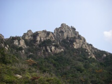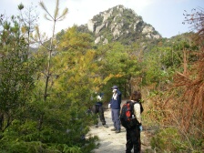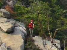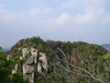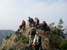 | 前ページからの続き 登山道に出て15分程度登ると尾根に出ます。右の展望台(平たい巨岩の上)があります。東側 の展望が楽しめます。休憩したら尾根を西に向け歩きます。上りきると花崗岩の砂が庭園のようなピークに出ます。さらに進むと、目の前が切れていて先に巨岩の絶壁が見えます。一旦下り上り返すと大きな板状の岩の下をくぐりさきほど見た巨岩の上に立つ事ができます。5分程度歩くと西目山山頂です。勝坂登山口から約1時間20分です。昼食を済ませ下山開始です。下山はまた違うルートで下ります。山頂を北に少し歩くと再び山頂標識があります。正式にはこの地点のようです。シダの中、足元が見えないので注意しながらどんどん高度を下げます。いつのまにか民家の中を歩いていて車道に出ます。振り返ると勝坂窯とあります。車道を横断して再び右田ケ岳勝坂登山口に向います。かなりハードだったのでここで2人車に戻る事になりました。勝坂登山口から右田ケ岳を下山して来た道を登ります。途中、尾根ルートとの分岐で今度は本ルートを行きます。本ルートもかなり急登で岩場では落石注意です。こちらを下りに使うのは危険かもしれません。登山口から40分程度喘ぐと立ちたくなるような巨岩があります。しばらく楽しんで再び10分程度急登を喘ぐと西ノ峰です。時間も3時を過ぎたので早々に進みます。鞍部に下り中ノ峰はすぐです。中ノ峰でしばらく展望を楽しんだり、達成感を味わったりして下山です。下山は山頂北側より尾根を行きます。ピークまで行くと今度は南側へと下って行きます。途中、鐘があったりでこちらもおもしろいコースです。やや薄暗くなってきて山頂から約50分で登山口です。標識には塚原登山口と書かれています。 <参考コースタイム> 右田小学校前−(5分)−天徳寺−(30分)−石船山−(50分)−中ノ峰分岐鞍部−(5分)−西ノ峰−(45分)−勝坂登山口−(10分)−西目山登山口−(70分)−西目山−(40分)−勝坂窯−(10分)−勝坂登山口−(10分)−尾根ルートとの分岐−(40分)−右田ケ岳西ノ峰−(10分)−中ノ峰−(50分)−塚原登山口−(15分)−右田小学校前 ※休憩時間は含んでいません。あくまでも参考タイムです。 全行程で7時間30分要しました。 <感想> 標高426mと低山ではあるが、岩峰の荒々しさと言い、岩の大きさと言い、スケールの大きさを感じた。また、今回のルートを紹介していただいた防府のメンバーに脱帽だ。 次ページへ |