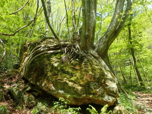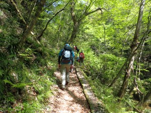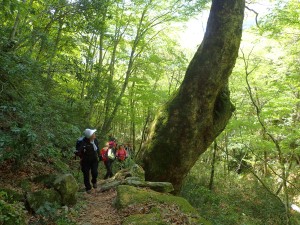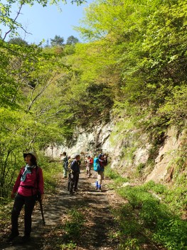 平成30年4月29日(日)天気晴れ ■出発時間:6時30分 北九州市小倉南区下曽根付近 ■メンバー:男性6名、女性8名 計14名 ジャガイモの大量栽培により、カタクリは、片栗粉としてはその名だけ残し役目を終えてしまった。しかし現在は、その可憐な花にハイカーたちは、魅了され、開花時期にはその姿を求めて奥深い山にでも足を延ばす。 我々も同様で約3時間もかけてカタクリが自生しているこの地にやってきた。 今回の山は、右谷山、カタクリの花はその隣の寂地山が有名であるが、そちらはとにかく人気があるため混雑が予想される。そこで隣の右谷山を歩くことにした。 寂地峡入口は、登山者で既に混んでいた。ここから寂地山を目指す登山者が多い。まずは、ここより滝巡りを楽しむ。滝が終わると石を削って掘られたトンネルがある。木馬トンネルとあるが、「木馬(きうま)」を調べると「木材搬出用のそりに似た道具」とある。この先に水力を利用した製材所があったとも聞いていたのでなるほどこの辺りは材木を加工して運んでたと想像できるわけだ。 赤い橋を何度か渡り、谷がY字に分かれる場所に出る。「タイコ谷出合」と言うらしい。ベンチがあって休憩にはちょうど良い。 この辺りから勾配がきつくなる。九十九折りの登山道を喘ぎながらも足下の花々に癒やされてミノコシ峠に到着。多くの登山者が昼食を楽しんでいた。 縦走路には、本日目的のカタクリの花が咲いている。花期は終盤のようで蕾は全くない。それでも色の褪せていない花を見つけると嬉しい。 昼食を済ませ、右谷山頂上を目指す。寂地山から続く縦走路には、カタクリが続く。飽きることなく右谷山に登頂。 狭い山頂にはテーブルがある。開けてはないが、細い樹が多いのでとても明るく見晴らしも良い。 集合写真を撮って下山開始。しばらく道の脇にはカタクリが続く。 道は植林帯の尾根道となり、突き当たるとそこが藪ケ峠のようだ。まっすぐ進むと小五郎山とある。 ここより直角に左へ降る。今度は谷沿いの道だ。花期を終えたショウジョウバカマが群落している。1週間ほど早ければきっとこの花も楽しめただろう。 ニリンソウの花などを見ながらそして滑床の沢に見とれてのんびりと降る。赤い橋を渡って林道に出るとキケマンの花が迎えてくれた。長い林道歩きも草花を楽しみながらだと飽きない。田園風景を目にすると出発点の駐車場は近い。 今回は、カタクリの花だだけでなく、たくさんの花を楽しませてもらった。 今日も山に自然に仲間に感謝!! ■コースタイム 寂地峡案内所-(20分)-木馬トンネル-(70分)-タイコ谷出合-(40分)-ミノコシ峠-(30分)-右谷山頂上-(40分)-藪ケ峠-(45分)-林道出合-(45分)-寂地峡案内所 ※休憩時間含まず。全行程で約6時間。歩行距離等:距離12.4km 標高差789m |