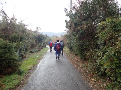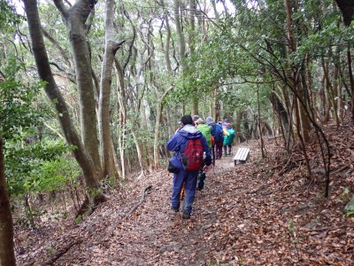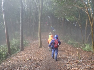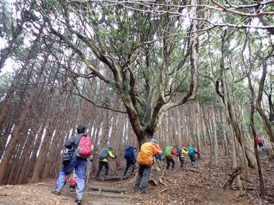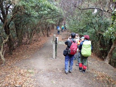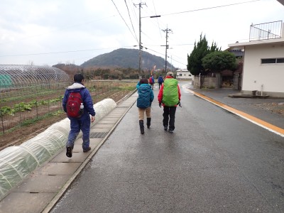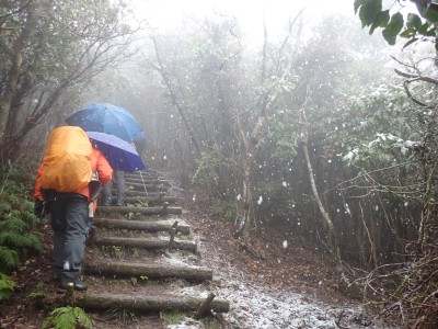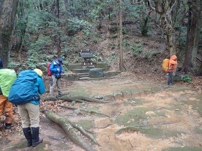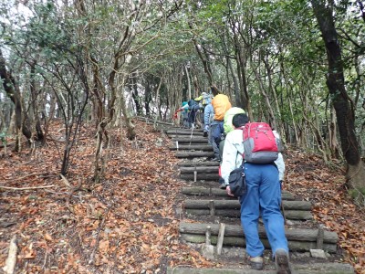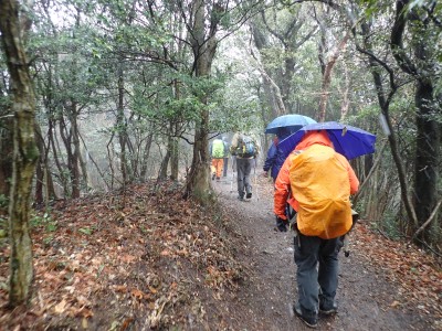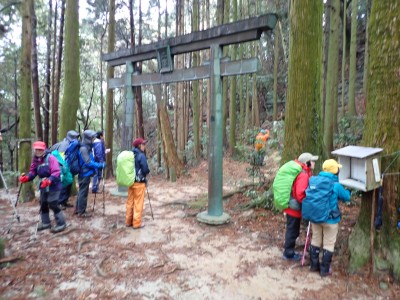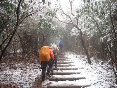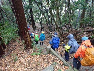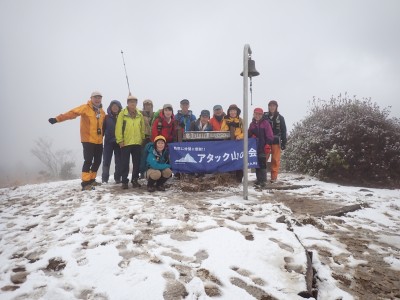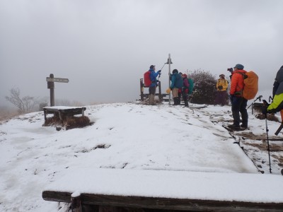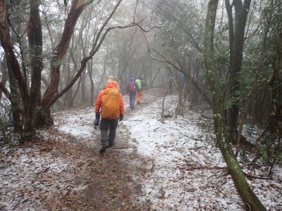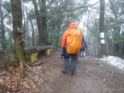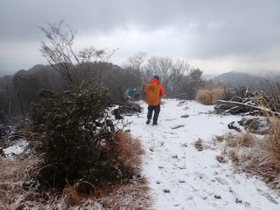 今年の干支の山は下関市の「竜王山」。新年なので下山後の二次会を予定し、公共交通機関を利用しての山行を計画。今回はメンバーのKさんがCLを務めてくれる。下見も一緒にしたので計画は完璧だが、朝から雨模様となり、新下関駅からバスに乗車する頃には雨が降り出した。下見ではすこぶる好天で展望を楽しんだが、今日はちょっと厳しそうだ。それでもバスを降りると少し青空が見えたので期待をして歩き出す。影山、シタキ場山と順調にピークを過ぎて行く。そして登山道は階段へと変わると雨がポツポツ。雌鋤先山に立つと青い海が見渡せるはずだが、遠望は真っ白である。雨が激しくなる前にと雨が当たらない場所まで降ってランチを何とか済ませる。「何とか」と表現したのは、雨の中、食事をするのは至難の業だ。ザックの出し入れだけでも雨がかからないように苦労する。「手がいくつもあれば」とこの時は思う。(でも、いくつもあったら気持ち悪いな)この時はなぜか女性と男性がグループで分かれてのランチタイムとなった。なぜかはわからない。雄鋤先山まで高度を上げて行くうちにみぞれが雪に変わって竜王山の山頂では3cmくらい積雪していた。これは私にとってはご褒美みたいなもので雪を踏みつけるとギュッと感じてとても気持ちよい。ガスの間から除く景色も幻想的でなかなかのものだと思う。青くて広い海を望むことはできなかったけど雪の竜王山は滅多に体験できないと負け惜しみみたいな自己満足。下山は龍王神社に立ち寄り、登山口からJR吉見駅まで歩く。予定より早い時間に到着し、駅前の蒲鉾屋さんでお土産を買う。そして電車を乗り継ぎ小倉駅で二次会。梯子はしないつもりだったが、誘惑に負けて梯子をしてしまい、前回の反省も忘れて飲み過ぎてしまったようで帰宅後、家内からまた注意された。「でもこれは止められそうにない」のは内緒の話。今日も山に自然に仲間に感謝!!
