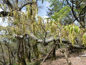 | キブシの老木に花が満開 | 急斜面を喘ぐと | 尾根に出る(林道が見える) |
