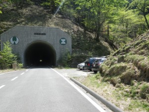 | トンネルまで林道を歩く | ミツバツツジがちらほら | 無事トンネル登山口(13:48) |