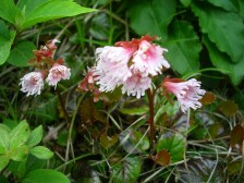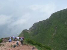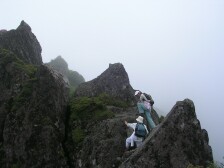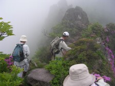 西峰山頂の東側にお鉢巡りできる登山口があります。少し行くと斜面にミヤマキリシマの大群落が見えます。この先の突端は崩落しているので決して入らないように注意です。(通行止めにしていました)ここより一旦下ります。そして岩をよじ登ったりしながらお鉢の縁を歩きます。 途中、東登山口からの分岐点があります。やがて東峰が正面に見えてきて(晴れていれば常に見えているのかもしれませんが)急登を喘ぐと東峰山頂です。ここで記念撮影をして巨岩の上にたったり、鍋底を見たりして下山です。今回は下山コースに由布岳西側に位置する飯盛ケ城(1067m)経由することにしました。マタエより合野越まで戻り、西口コースの登山口から林の中をくぐり、開けると目の前が飯盛ケ城です。ここからの由布岳の眺めもなかなかです。ここから南側のなだらかな下りを由布岳登山口まで歩きます。 <参考コースタイム> 正面登山口−(40分)−合野越−(70分)−マタエ−(15分)−西峰山頂−(60分)−東口コースとの分岐地点−(15分)−東峰山頂−(15分)−マタエ−(60分)−合野越−(15分)−飯盛ケ城山頂−(30分)−正面登山口 ※あくまでも参考時間です。全行程で約5時間30分でした。 <最後に> やっと念願の由布岳お鉢巡りができた家内は、思わぬミヤマキリシマの群生も見れて二重の感動で帰宅できました。岩場も慣れたもので全く物怖じせず、平気なようです。天気も朝は愚図ついていましたが、ガスがあるだけで晴れてきて最高の山歩きができました。遊山歩の例会としては参加者が少なく淋しい気もしますが、満足の1日でした。MORIさんに改めて感謝です。 <おまけ> 障子戸を登る登山者 大画面 ちょっと画像が粗いけど・・・ |