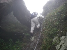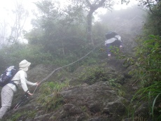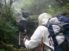 2008年9月23日(火)秋分の日 天気曇り 久しぶりにMORIさん夫妻と出かけることになった。今回もMORIさんの提案で由布岳を行くことに。家内は9月初めての山で私も2週間歩いていないので少々心配だが、東登山口からの初めてのコースなので楽しみだ。築上町メタセの杜に6時に集合。途中、豊前おこしかけでトイレ休憩をして登山口にはAM7時30分に到着。 <アクセス> 北九州方面からだと宇佐別府道を院内料金所手前(左に出る)で降りて国道387号線を右折し、円座の先を左折し、国道500号線へ 道なりに行く。高速のガードをくぐり右折する。高速道沿いに進み、塚原温泉を左に見てガードをくぐり、すぐに左折し、再びガードをくぐって行く。鶴見岳と由布岳の間を行き、しばらく行くと右手に案内板がある東登山口に着く。車は反対側に数台駐車スペースがある。(鎖がかかっている) <コース詳細> 登山口から数メートルで右手にトイレがあります。さらに東屋もその先にあります。自然林のなだらかな登山道をやや左方向(西南)に向けて歩きます。涸れ沢が左に並行すると勾配がきつくなり尾根に出ると日向越です。左に行くと日向岳でまっすぐ行くと観察路を経て正面登山口からの登山道に合流します。今回は右手東峰を目指します。勾配は徐々にきつくなりますが、トリカブトなどの花々に感動し、きつさも忘れます。やがて岩が多くなり鎖場となります。霧雨で岩は濡れているので慎重に登ります。下方を見ますがガスで何も見えません。晴れていればきっと素晴らしい景色だろうと思いながら汗を拭いながら登ります。稜線に飛び出すと東峰と西峰と書かれた標識があります。お鉢の縁に出ました。ここからまずは東峰を目指します。急登しながら巨岩の下をくぐり岩場を行くと山頂です。時計を見ると10時半でした。ここで昼食?にします。昼食を済ませたら西峰目指し出発です。東峰から北に下るとマタエと言われる鞍部です。多くの登山者がここで一息ついています。西峰へはここから障子戸と言われている岩を登ります。前回来た時よりも黄色ペンキがはっきりと塗られていてルートが明確なので登りやすいと感じました。(次ページへ) |