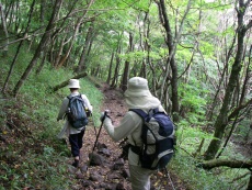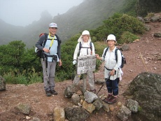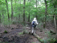 岩場をクリアしてヤセ尾根に出てしばらく歩くと西峰に到着です。晴れていれば素晴らしい景色だったはずです。西峰でしばらく休憩して来た道を戻ります。岩場は下りの方が難しいのですが、スムーズにクリアです。下山はマタエから正面登山口を目指しますが、途中から観察路に入り、日向岳に寄って東登山口へと下山します。某社の山の地図では合野越から少し下った所に取り付きがあるはずですが見当たりません。結局、ほとんど柵があるところまで下り観察路の標識に従い、日向岳を目指すことにしました。日向岳まではほとんど上りで下ったあとの上り返しはきついものでかなりバテました。しかし、苔むした岩やソババッケのようなところにある沼が疲れを忘れさせてくれました。沼から印を見失ってしまいましたが、丘のような地形なのでとにかく上り詰めると日向岳山頂です。山頂から東登山口を目指しますが、山頂の北側に標識があります。一旦東側へ下るとUターンするように西へ進路をとります。地形図を見るとどこを歩いているかすぐにわかるかと思います。しばらく平坦な道を歩くと日向越です。ここからは今朝歩いた道を戻ります。 <参考コースタイム> 東登山口−(40分)−日向越−(40分)−お鉢の淵−(15分)−東峰−(10分)−マタエ−(15分)−西峰−(15分)−マタエ−(60分)−合野越−(15分)−観察路入口−(75分)−日向岳-(25分)-日向越-(30分)-東登山口 ※あくまでも参考時間です。全行程で約7時間30分でした。 <地図に注意> 東登山口にある「猪瀬戸園地案内図」のコースが意外とわかりやすいので見ておくと良いかと思います。今回、地形図以外に某社の山の地図を持っていったのですが、地図が古いのかどうも違うようです。 |