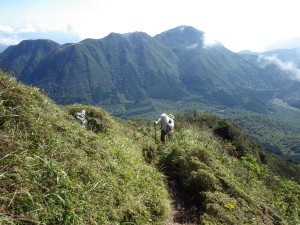 2014年9月14日(日) 天気 晴れ ■出発時間:AM6時30分 道の駅湯布院 ■メンバー:家内と2人 外灯で明るい夜は、目が覚めるたびにもう朝かと思い時計を見る。そんな一晩を道の駅で過ごした。朝が近づくと満車状態の駐車場には多くの車のマフラーから排気ガスが蒸気のように出ていた。それだけ寒い朝である。 朝焼けに映る由布岳を見て深呼吸をする。今日の始まりに感謝である。 湯を沸かし、簡単な食事を済ませると道の駅をあとにし、由布岳に近づきながら車を走らせる。この辺りのコンビには24時間営業なので昼食の準備も心配ない。 昨日歩いた鞍ケ戸のスタート地点でもある由布岳東山口に再び到着。車を停めるとちょうど後部に軽自動車が停まった。登山者である。既に車は2台程度あるが、おそらくこれからこの路肩は車の数珠となるのであろう。 登山届けを記入し、樹林帯に入る。すぐにトイレ、東屋がある。樹林帯の中なので湿っぽい感じがする。緩やかな登りの道は、徐々に朝陽を浴び明るくなってきた。 大きな岩の間を歩いたり、植林帯の中を歩いたりして急斜面を登りきると日向越に着く。 ここで私たちよりも後から歩いて来た単独行の男性に追い抜かれる。 休憩して歩き始めると二人の登山者が降って来た。いつ登ったんだろう。 本格的な登りになると道はジグザグとなり、高度を上げロープが見えると直登の厳しい登りとなる。ロープ場は結構長く続く。振り返るといつのまにか視界が開けていて城島高原辺りが小さく見える。樹林帯も潅木帯となってくると視界が益々広がり立ち止まって絶景を楽しめる。 そうなると当然ながら陽射しは強くなってきて少々暑いが、絶景と岩場、そしてトリカブトやフウロ、フクオウソウと花もたくさんみれて暑さを忘れてしまっていた。 垂直の岩壁の鎖場をクリアしてさらに岩を何度かよじ登って上を見ると帽子の形をした東峰が見えてきた。 登りも終わる頃は笹の道となり、お鉢巡りの縦走路に出る。(標識がある) これより東峰を目指し進む。目の前に西峰を見るとたくさんの登山者がいる。 東峰への道は、数多くの登山者と離合しながら進む。お鉢巡りもメジャーコースになってしまったようだ。登りきって大きな岩の上を飛ぶように渡るとたくさんの登山者が東峰山頂で記念写真を撮っていた。 ページへ |