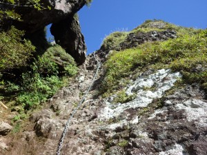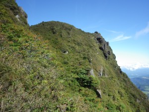 | 鶴見岳を背に | 鎖場は垂直の岩壁(9:27) | 三点確保でクリア |