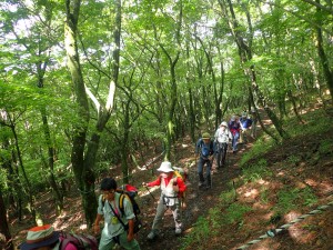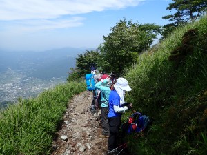 | 頂上部が見えた! | 狭い登山道なので休憩も一列に並ぶ | 手前が飯盛ケ城、奥は倉木山や城ケ岳 |