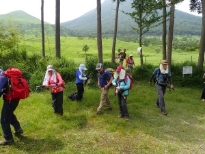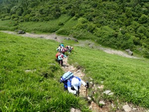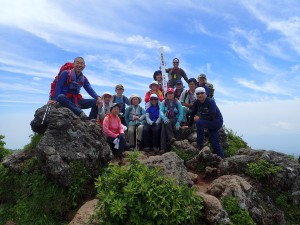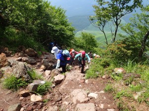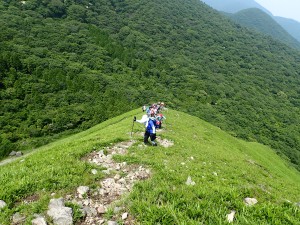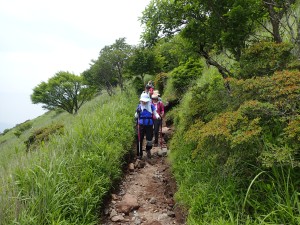 平成30年6月24日(日) 天気晴れ ■出発時間午前:6時30分(小倉南区津田付近) ■メンバー:14名(男性6名,女性8名) 心配していた「雨」は一転して「晴れ」の予報に。前回の平治岳山行も同じような心配をしたのだが、どうやらメンバーの日頃の行いがとても良いのであろう。(笑)貴重な梅雨の晴れ間の山行なのできっと楽しいだろう、いや楽しまなきゃ。 高速道は、由布岳スマートI.Cで流出(スマートインターを下りることを「流出」と言うらしい/メンバーのMさん)し、正面登山口の無料駐車場は既に満車なので有料駐車場に停める。外に出ると涼しくて気持ちよい。準備体操をして出発。若い団体さんと平行に歩くが、すぐに追い越され後を追う形となる。森林帯を一旦抜けると休憩ポイントでもある合野越に出る。再び森林帯に入り、しばらくジグザクに歩くと灌木帯となり眺望が開ける。日差しは強いが心地よい風で暑さを感じない。ほんのりとピンク色したヤマボウシ、たくさんの花をぶら下げた紅ウツギ、鈴なりに白く咲いているネジキなど狭い登山道は、結構楽しめる。休憩ポイントはなかなか見つからずに結局一列に並んで休む。ジグザクが直登になると西峰と東峰の間のコル「マタエ」は近い。マタエに立つと風が強い、体が冷えてきたので長居はせず、山頂目指す。露出した土の登山道は滑りやすく、落石も注意だ。急登から平坦な広場に出るとちょうど若者の団体が頂上から広場に降りてきた。どうやらランチをここでするのだろう。私たちは東峰頂上でランチをすることにした。さて、下山は合野越から飯盛ケ城に立ち寄る。若者の団体チームが前を行くが下山に強い私たちはぴったりとついて行く。合野越での休憩を終え、ここからは別ルートだ。飯盛ケ城へと森林帯を進むといきなり視界が開け、目の前に三角形の飯盛ケ城が現れる。一気に上り詰めると最高の眺めだ。なぜか東峰に立ったときよりも皆喜んでいるように見える。下山は草原を歩く。皆の満足そうな笑顔が、たまらなく好きだ。 今日も山に自然に仲間に感謝!! ■コースタイム 正面登山口-(40分)-合野越-(80分)-マタエ-(20分)-東峰-(15分)-マタエ-(75分)-合野越-(20分)-飯盛ケ城-(35分)-正面登山口※休憩時間含めず。全行程で約6時間かかりました。距離8.29km、標高差808m |
