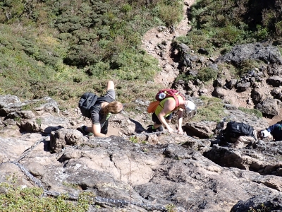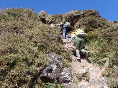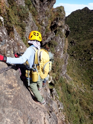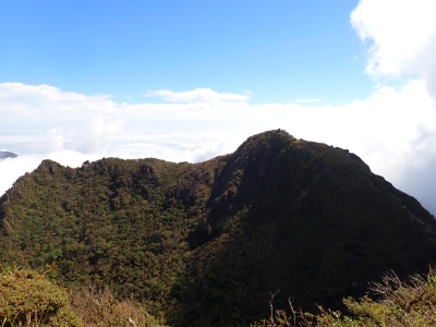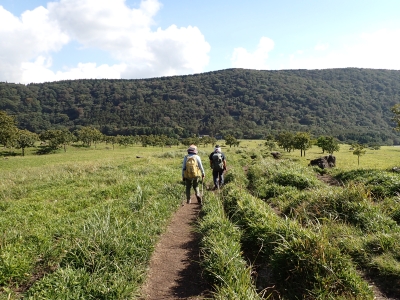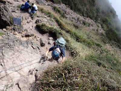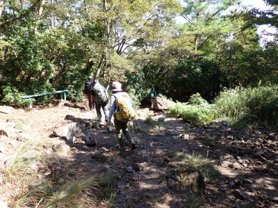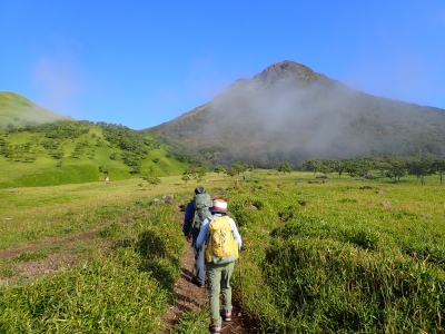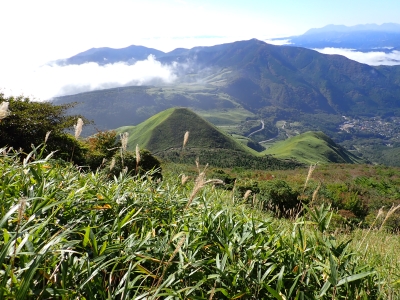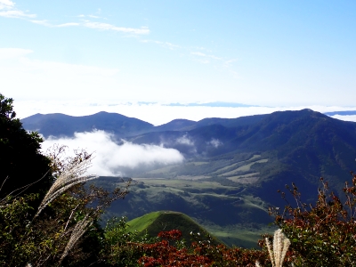 アタック山の会9月の例会山行が、天候の影響で延期になり本日となったが、三連休と運動会シーズンともあって参加者がなんと3名と今まで最小の参加人数となった。CLはM氏、とても残念だけどこういう時もあると互いに励ます。それにしても今年の夏は長い。10月中旬だと言うの日中の気温は30度越である。由布岳の駐車場に着くともちろん快適な気温だが、歩き出すと陽射しを背に受けて暑さを感じ出す。森に入るとしばらくは涼しさを感じる。合野越で一休みして樹林帯を高度を上げながら歩く。ジグザグな道が続き、森を抜けると陽射しが熱い。展望が開けると何と雲海が広がっている。雲の上を歩けるような錯覚を起こす。徐々に足下の石が大きくなってゆき、鞍部の手前ではガレ場となる。その頃には後部から多くの登山者から煽られるようにマタエに着く。さすがにここは標高も高く、風もあって涼しい。日影で少々長い休憩をしていよいよ西峰への岩場へ取付く。ヘルメット、スワミベルト、シュリンゲと少々大げさかも知れないが、安全確保は会の決まりである。特に高齢になると腕力も衰えて自力でのリカバリーは困難である。鎖場を慎重にクリアしてゆく。特に障子戸と言われる岩壁は危険だ。ここでは過去滑落事故で亡くなった方もいる。無事、西峰に着くと展望が迎えてくれた雲海も素晴らしい。ここでランチタイムを過ごしていると登山者が次から次へとやってくる。下山は往路を戻るが、登りで慣れたせいか、スムーズに鎖場をクリアしていった。マタエからの下山は、登ってくる人とのすれ違いでこの山の人気がとてもあることを改めて知る。駐車場が見えてくると暑さが厳しく汗だらけで登山終了。今日も山に自然に仲間に感謝!