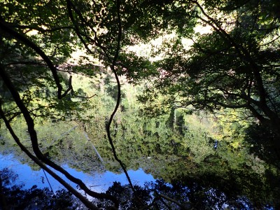 | 野口池 | 確かに対岸の景色が写っている | 杉林を登る | |