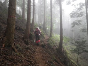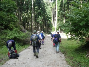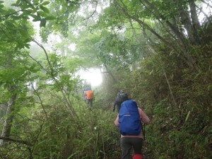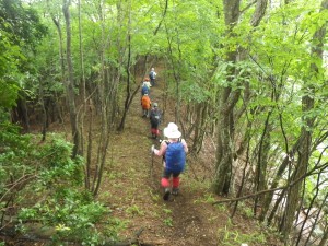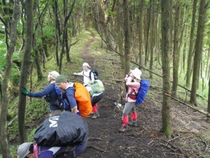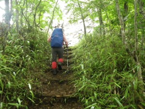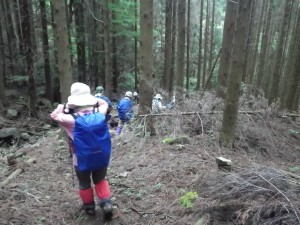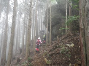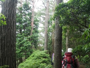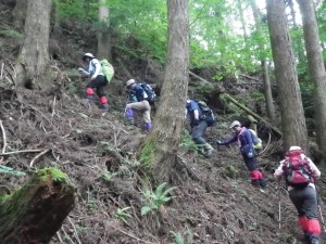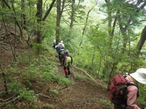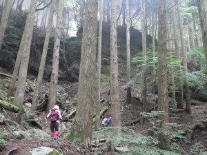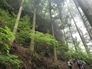 | 杉林を歩く、上部には岩壁 | 急登する | 杉の中に緑が映える |