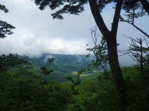 2011年7月17日 天気 曇り ■出発時間:午前5時30分(自宅) ※午前6時10分豊前おこしかけ着 ■メンバー:MORIさん夫妻、信ちゃん夫妻、あこちゃん夫妻、がしんさん、私たち夫婦の9名 遊山歩7月例会登山は、緩木山から祖母山、越敷岳を周回する山中一泊登山が計画されていた。しかし、台風の影響で悪天候が予想されたため、途中で観光に切り替えようとなり、まずは原尻の滝へ。ところが降っていた雨もやみ、空は明るくなってきた。とりあえず、登山口まで行くことになった。(ここまで来られたあずきさん、KENさんはここで引き返され、とても残念でした) 登山口に着いたのは既に10時45分。ここで祖母山は諦めて緩木山と越敷岳の周回コースとなった。速やかに登山準備をして出発だ。幸い、曇り空なので暑さもほどほどである。コンクリートの林道をしばらく歩く。T字路に緩木山への道標があるので標識通りに進み砂防ダムを過ぎて右に取付点がある。杉林の中、高度を上げてゆく。大きな岩壁が多くなる。湿度が高いので汗が途切れなく出て手ぬぐいが役に立たない。緩やかな斜面から尾根に出ると石塔と道票があるので寄ってみる。確かに石の塔が立ち並ぶ。ガスっているせいもあって何だか気味が悪いのですぐに引き返す。元宮との分岐標識を見て杉林をひたすら登る。巨岩の横を通過して急登すると一旦開けるが再び杉と自然林の樹林帯の尾根道を歩く。きつい上りがいつまで続くかと思っていたらようやく越敷岳への縦走路と緩木山頂上への分岐標識が目に前に現れた。もう一息だ。急斜面を一気に喘ぐと山頂に着いた。時計を見ると12時16分。待ちに待ったランチタイムだ。家内が昨夜準備してくれた「そうめん」を喉に滑らす。残念なことに大好きなワサビを忘れてきたが、夏は冷たい「そうめん」が一番だ。12時45分、霧雨の中ランチを終えて縦走路まで下り、越敷岳を目指す。しばらく杉林の尾根歩きが続く。ブナやヒメシャラの自然林になると木の間から眺望が開ける。岩場を過ぎると立派な赤松の尾根道となる。松茸がないかと思いながら下を見ながら歩く。そんな簡単に見つかるわけがないのに・・・。樹林帯を抜け平坦な道になったところで、雨に当たりだしたのでザックカバーを着けようとすると前からツアーの団体さんが通り過ぎる。メンバーの中に知り合いがいたようで声をかけあっていた。さすが顔が広いと感心する。笹の急斜面を登り詰めると稜線に出た。左に行くと祖母山だ。多少未練があるが右(西)に進路をとる。稜線歩きは気持ちの良いものでガスがなければ、最高の景色であろう。しかし、この時期、晴れていれば炎天下だったかも知れないと思うと、このような天候でむしろ良かったのだろう。風も心地よく汗も引いてきた。14時10分、1106.8mの三角点に着く。適度なアップダウンを繰り返し、左に筒が岳が見えてきた。雨は止んで晴れ間も出てきた。目の前に大きなテーブル状の岩山が見えた。なるほどこれが越敷岳か。階段状の道を駆け上がると大きな岩壁が立ちはだかる。思わず「わー!」と声が出る。山頂へは、ぐるっと巻き道があるがどうも右からも左からも行けるようだ。先頭が右に行ったのでついてゆく。すぐに御神水がある。この水を飲むと知恵を授かると書かれている。最後の急斜面を登り詰めて15時ちょうど、山頂に飛び出た。幸い、ガスが切れて遠望を楽しめた。一休みして逆周りで岩壁の下まで降りて下山開始である。山賊の岩穴を除いて緩木神社への分岐まで戻り、そこから急斜面を降る。岩壁の横を歩くと御聖洞とある。修行の地らしい。周りが杉林となって仙人枕と言う棒状の大きな岩を見る。不思議な岩である。順調に降って林道に出た。あとは林道歩きと思ったが、途中ショートカットできそうな道があるので入り込む。予想通りで再び林道に出た。しばらく真っ直ぐ歩いて行くと今朝登って来た林道に出くわす。登山口はすぐだ。空を見るととても台風が来ているようには見えない。しかし、ここは安全第一、帰路に着くことにした。汗だくのまま4時間以上も車の中というのも気持ち悪いので一緒に同乗した来たがしんさんと温泉でも行こうと言うことになり、竹田温泉に立ち寄った。風呂あがりにノンアルコールビールとチャンポンを食べ、無事帰宅した。今日も感謝の一日であった。 ■コースタイム 登山口−(35分)-取付点-(25分)-石塔-(30分)-緩木山頂上-(70分)-祖母山との縦走路-(20分)-1106.8m三角点(50分)-越敷岳-(50分)-仙人枕-林道ショートカット-(10分)林道-(15分)-登山口 ※休憩時間は含くまれていません。全行程で約6時間でした。 ■温泉 竹田温泉「花水月」HP 入浴料大人500円 |