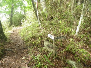| 東側を見ながら歩く | 稜線が見えてきた | 稜線に出ると祖母山との縦走路の道標 |