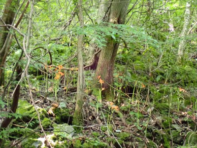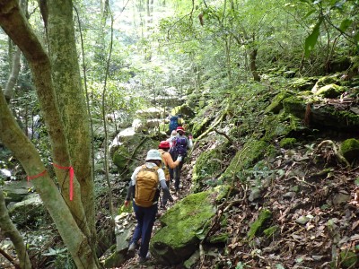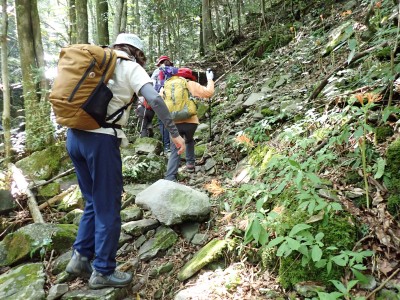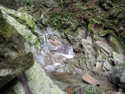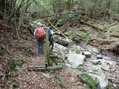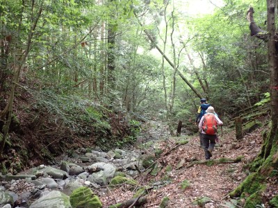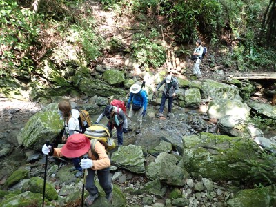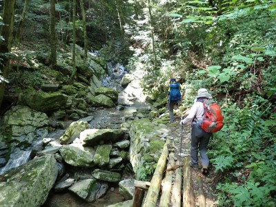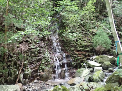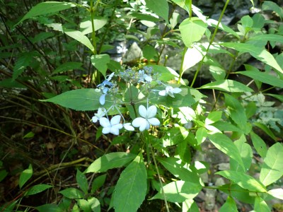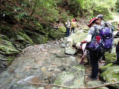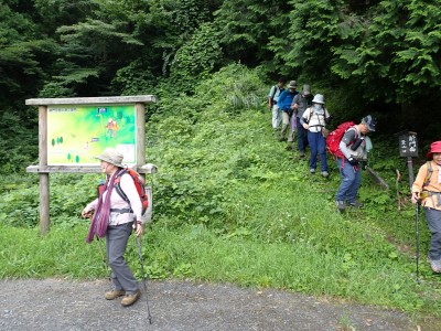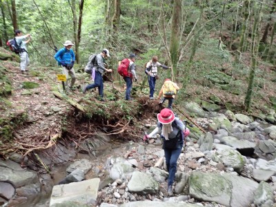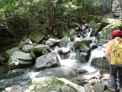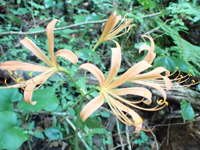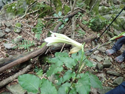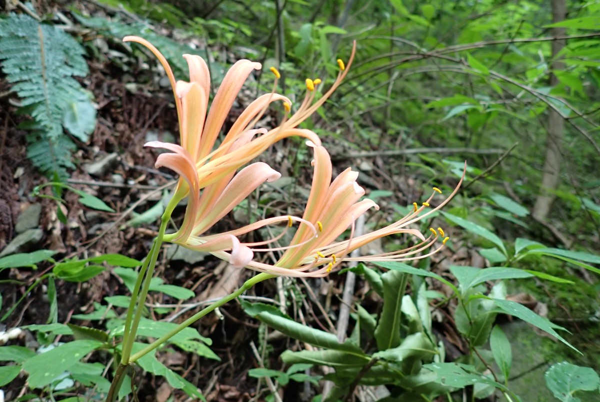 九州道は、古賀SAで一人ピックアップして広川I.Cで降りる。国道から県道へと進み、矢部川をどんどんと昇って行く。ダム湖を見ながら進み前門岳登山口の標識より右折し、しばらく進むと左折し、林道に入るがすぐに登山口の案内板がある。駐車スペースは道路脇となるので十分配慮が必要だ。車から降りるととてもい涼しい。快適な登山が楽しめそうだ。準備体操をして出発。沢沿いを進む。渡渉箇所は水量が少ないせいか難しい場所はない。ロープ場も特に注意すれば問題ない。オオキツネノカミソリは咲き始めで予想していたより群生している。谷を詰めて行くとやはり勾配はきつくなる。ようやく鞍部に出ると再び急登。アキレス腱が伸び伸びになる。ピークに来たと思ったら少しだけ降って登り返す。するとすぐに頂上だ。頂上は狭いがおおよそ270度の展望が開けていて釈迦ヶ岳・御前岳を拝むことができる。ここでランチタイムだが、陽が差してきて暑さを感じたので少し戻り、日陰で過ごした。下山は往路を戻るが、U氏がとても珍しい植物(花)をみつけていたので撮影会が始まった。下山して駐車スペースで帰る支度をしているとなんとマイクロバスが入ってきた。きっと頂上付近で入れ違いになったグループのお迎えであろう。猛暑の日々、こんなに涼しく歩けたのは企画してくれたH氏のおかげである。本当に感謝だ。車に乗車し、秘境杣の里に立ち寄るが、何と雨が降ってきた。何とも運の良いことだろう。販売所では、地元の人が作った自家製の瓶詰めのわさび漬けがあったので購入。矢部村が、葉わさび福岡一の生産を誇るそうだ。帰宅後のビールを楽しみに2時間半の道程をゆっくりと帰った。今日も自然に山に仲間に感謝!